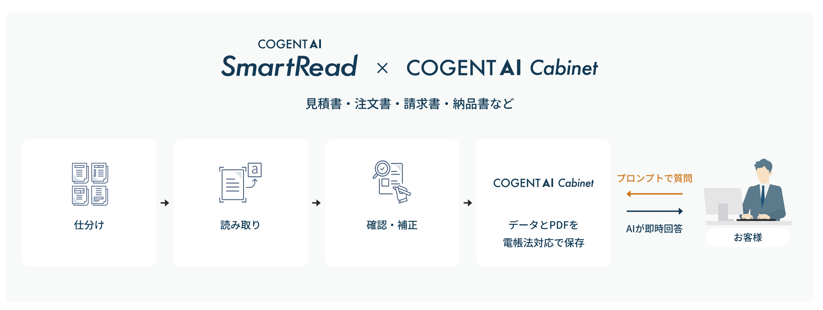 SmartReadは、高精度な文字読み取りだけでなく、複数文書の自動仕分けや後続システムとの連携など、文書処理の各プロセスを効率化することで、紙文書や文書画像からのデータ抽出やデータ活用に関する企業の課題を解決します。