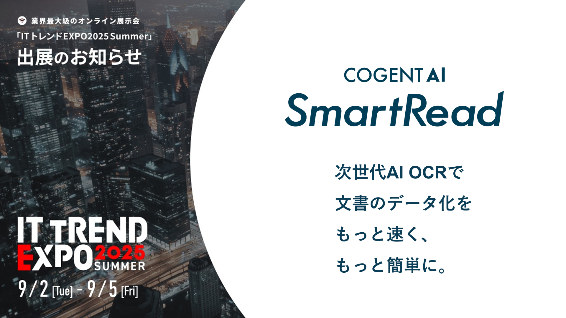 最先端人工知能(AI)技術の開発と提供を行う株式会社Cogent Labs(本社:東京都港区、代表取締役社長:CEO エリック・秀幸・ホワイトウェイ、以下コージェントラボ)が提供する「SmartRead(スマートリード)」 は、株式会社イノベーション(東証グロース 証券コード3970)のグループ会社である、株式会社Innovation & Co(本社:東京都渋谷区、代表取締役社長:齊藤和馬、以下「Innovation & Co」)が主催する業界最大級のオンライン展示会「ITトレンドEXPO2025 Summer」に出展します。
